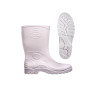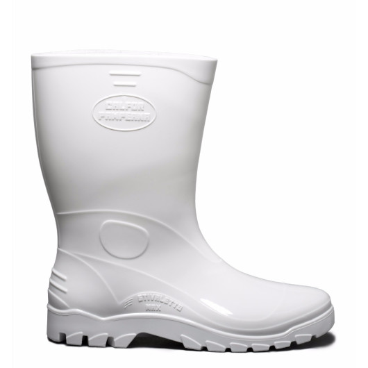 Bota ocupacional, em cano médio (desenho topo C), na cor preta, impermeável, solado antiderrapante de uso profissional, cabedal confeccionado em policloreto de vinila (PVC), solado em PVC, injetada em uma peça só. Proteção ao escorregamento em piso de cerâmica contaminado com lauril sulfato de sódio (detergente); resistente ao óleo combustível (solado) (FO) e resistente a produtos químicos. Acabamento interior com meia de poliéster.