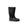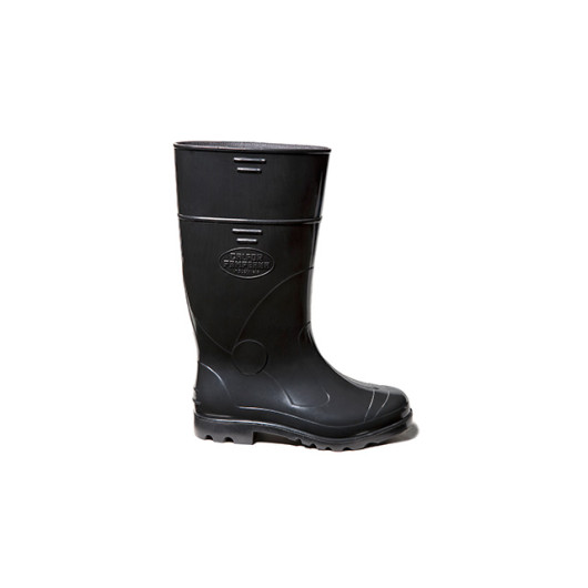 Calçado ocupacional tipo bota, em cano longo (desenho tipo D), na cor preta, impermeável, solado antiderrapante de uso profissional, cabedal confeccionado em policloreto de vinila (PVC), solado em PVC, injetada em uma peça só. Proteção ao escorregamento em piso de cerâmica contaminado com lauril sulfato de sódio (detergente) (SRA), resistente ao óleo combustível (solado) (FO). Acabamento interior com meia poliéster.