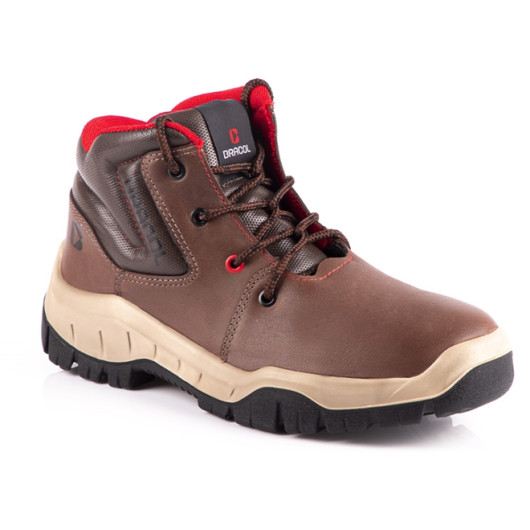 Cabedal: Confeccionado em vaqueta hidrofugada, couro com teor graxo 17/19 linhas, forração interna da gáspea em não tecido de forro do cano em tecido com alto poder de absorção de suor e permeabilidade.