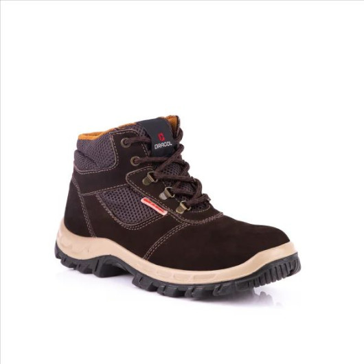 Botina para uso ocupacional com fechamento por atacador, confeccionada em vaqueta nobuck, semi-fole e colarinho em AIR MASH de alta respirabilidade, forro interno na gáspea não tecido e forro do cano em SANITEC dublado com manta de não tecido com tratamento antimicrobiano, biqueira plástica, palmilha de montagem não tecido, solado injeção direta bidensidade bicolor e sobrepalmilha antimicrobiana.