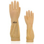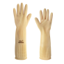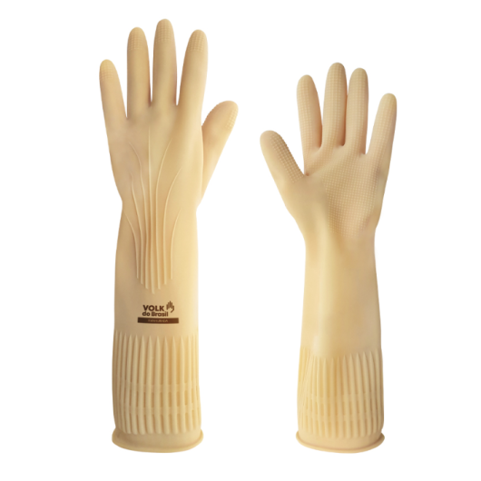 Luva de segurança confeccionada em látex natural, relevo antiderrapante na palma e ponta dos dedos, detalhes de ranhura no punho.