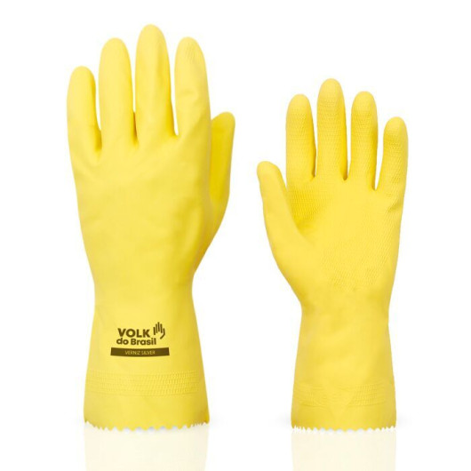 Luva de segurança confeccionada em látex natural, revestimento interno em verniz Silver, antiderrapante na palma e face palmar dos dedos.