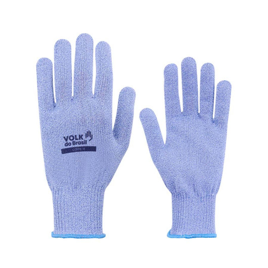 Luva de segurança confeccionada em fios sintéticos, fios de aço, punho com inserções de fibras elásticas e acabamento em fibras sintéticas.